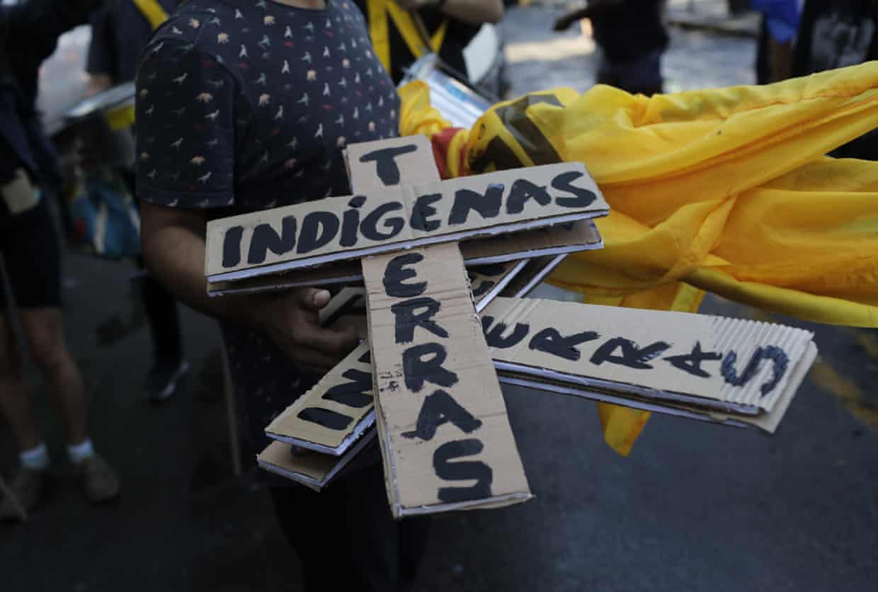 A person holds cardboard crosses that read ‘indigenous land’ during a protest against budget cuts on public education by President Jair Bolsonaro’s government. Photograph: Silvia Izquierdo/AP
