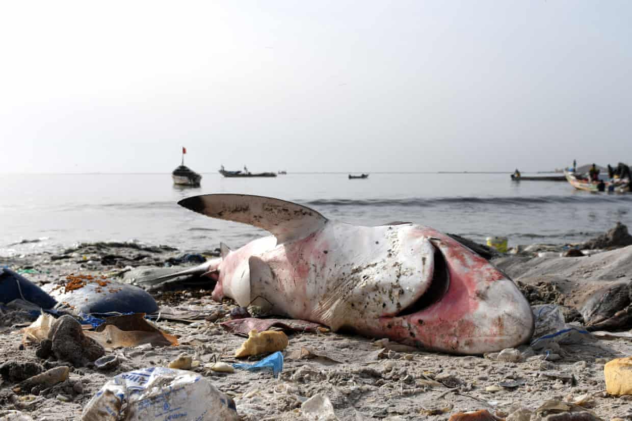 A dead shark surrounded by litter on the beach at Hann in Dakar. Photograph: Seyllou/AFP/Getty Images